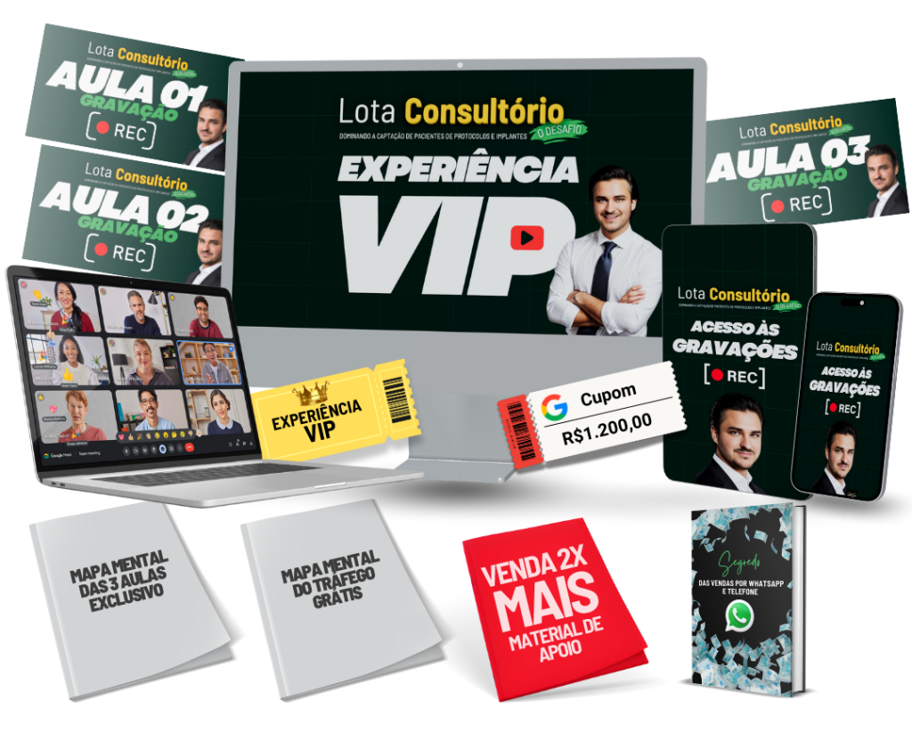 - Treinamento ao Vivo de 3 Dias sobre como lotar seu consultório, com as ferramentas mais modernas, com acesso exclusivo via Google Meet